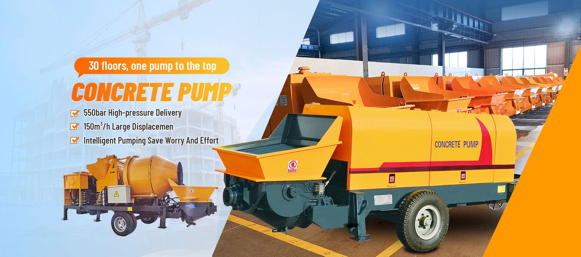 Stepless pumping capacity adjustment and variable speed control technology enable simultaneous changes in concrete working conditions and displacement.