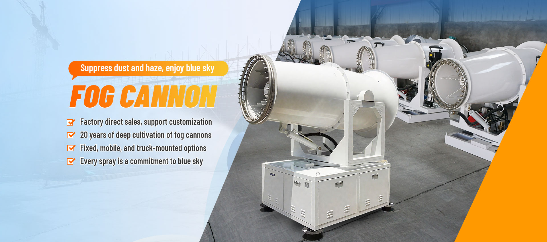 Mist cannons are environmentally friendly devices that reduce dust through high-pressure atomization and fan jets. They have a range of 30-150 meters, support intelligent linkage and remote control, conserve water and electricity, and are resistant to high and low temperatures, operating stably in environments ranging from -30°C to 50°C. Available in vehicle-mounted, fixed, and tower-mounted configurations, they are suitable for use in construction sites, mines, roads, and other locations. With a PM10 purification rate exceeding 90%, they can quickly meet environmental protection acceptance requirements.